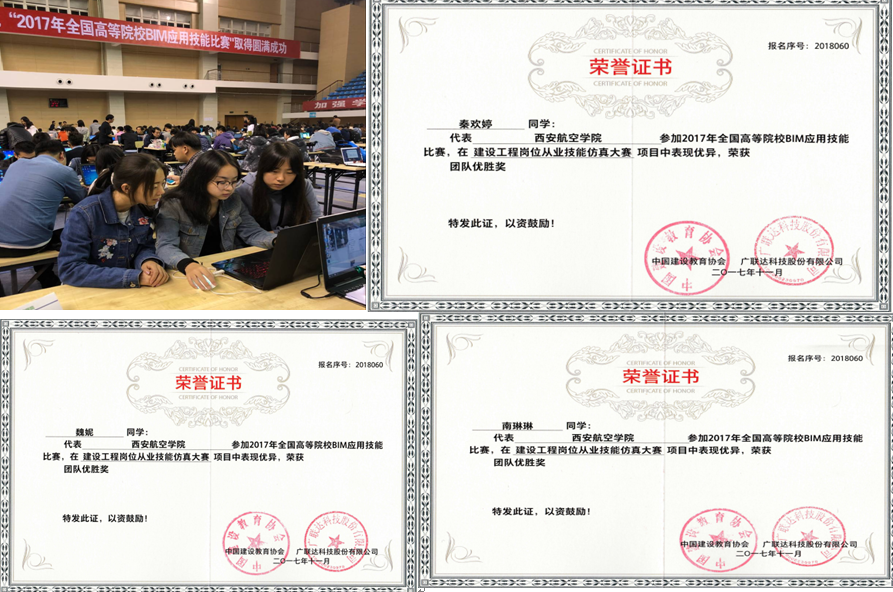 由中国建设教育协会主办,江苏建筑职业技术学院承办,广联达科技股份有限公司协办的2017年“全国高等院校BIM应用技能比赛”总决赛于2017年10月29日举行,由汪丽、党伟、李华志老师指导的团队参加了第一届建设工程岗位从业技能仿真大赛,共有80多所高校参赛,经过四个小时的紧张角逐,最终获得了本科组的团队优胜奖。