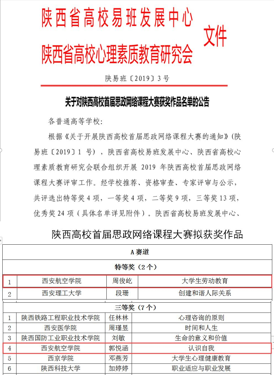 近日,由陕西省高校易班发展中心、陕西省高校心理素质教育研究会联合主办的2019年陕西高校首届思政网络课程大赛结果揭晓,我校能源与建筑学院辅导员周俊屹荣获A赛道特等奖,机械工程学院辅导员郭悦涵荣获B赛道三等奖。