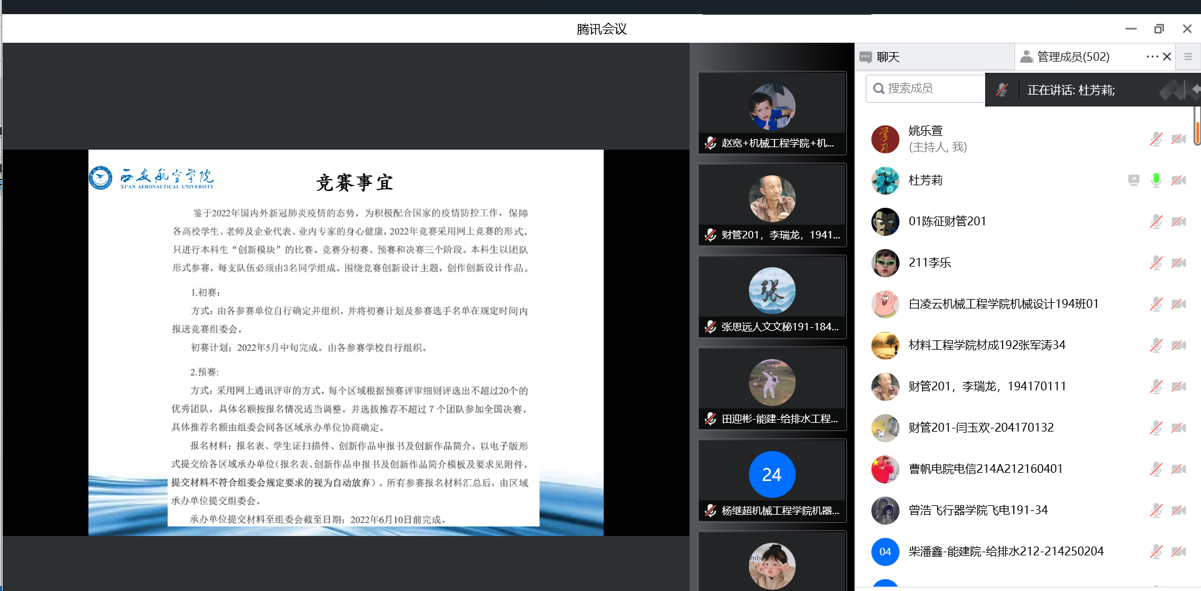 5月12日下午16:00建环专业负责人杜芳莉通过腾讯会议举办了2022年中国制冷空调行业大学生科技竞赛知识普及讲座。本次讲座从学科竞赛简介、专业创新思维分析、创新能力提升策略、学科竞赛经验分享等方面进行展开。