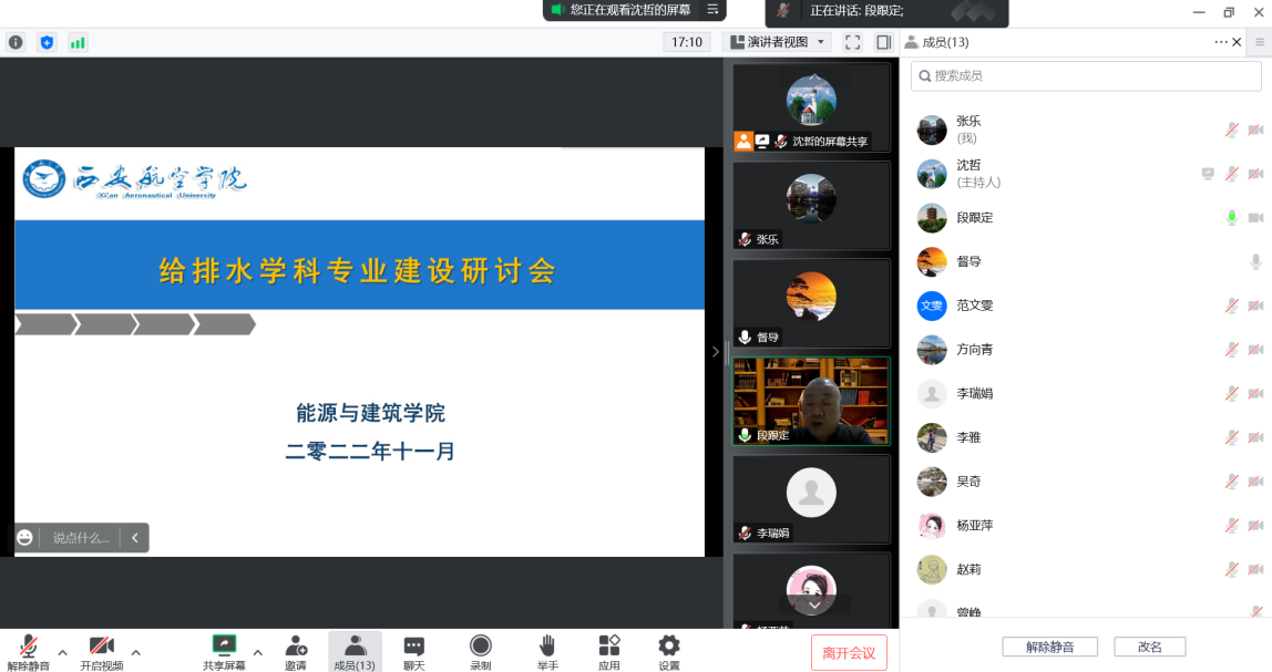 2022年11月11日晚7点,给排水教研室通过线上会议召开了学科专业建设工作研讨会,学校督导雒新峰、学院院长杨亚萍、给排水教研室全体老师参加了会议,会议由教研室主任沈哲主持。