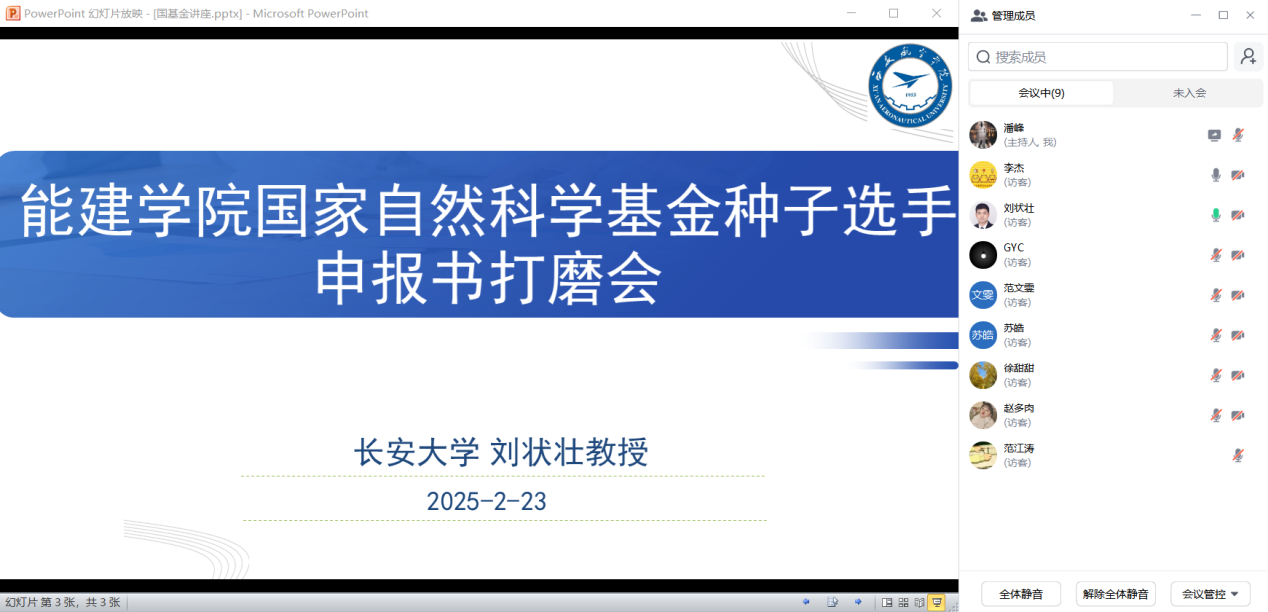 为持续深化国家自然科学基金培育工作,进一步提升学院教师申报书质量,2025年2月23日,能源与建筑学院以线上会议形式召开国家自然科学基金种子选手申报书专项打磨会。会议特邀长安大学公路学院道路系副主任、博士生导师刘状壮教授担任指导专家,对学院遴选的6名 “种子选手”进行一对一针对性点评打磨,会议由学院副院长李杰主持。
