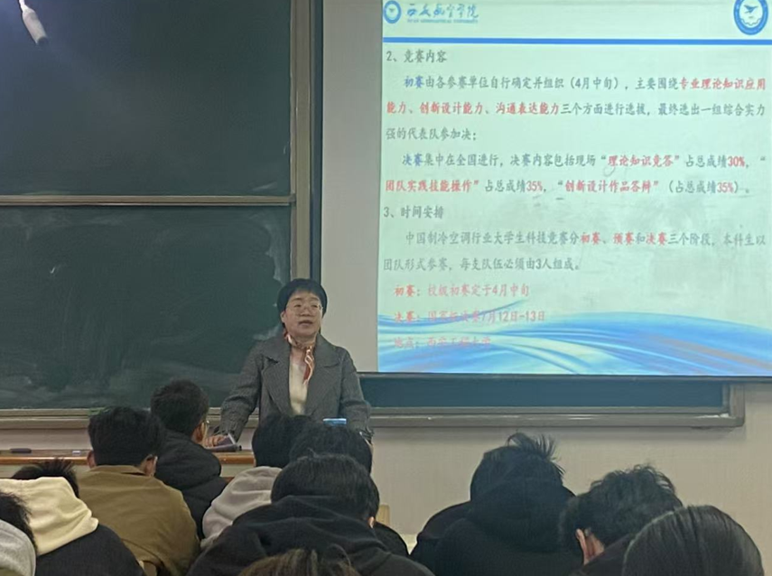 首先,杜芳莉老师为同学们介绍了制冷空调及节能减排方面竞赛的宗旨以及竞赛内容;其次,杜老师向同学们介绍了竞赛的流程以及竞赛事宜,为同学们点明了竞赛的前沿主题以及行业的热点话题;与此同时,杜老师重点讲解了各竞赛的报名形式、报名地点、竞赛成绩的分数占比及创新作品答辩要求等;之后,杜老师针对本专业的行业背景以及发展方向,结合实际案例说明创新思维和创新能力在竞赛中的重要性;接着,杜老师为同学们提出了如何提高创新能力的宝贵意见,主张多提问、多思考、自主或通过团体解决建筑环境及节能减排等领域中的复杂工程问题;最后,杜老师结合自身多年的带队经验进行分享,给同学们展示了以往的参赛项目以及获奖作品。
