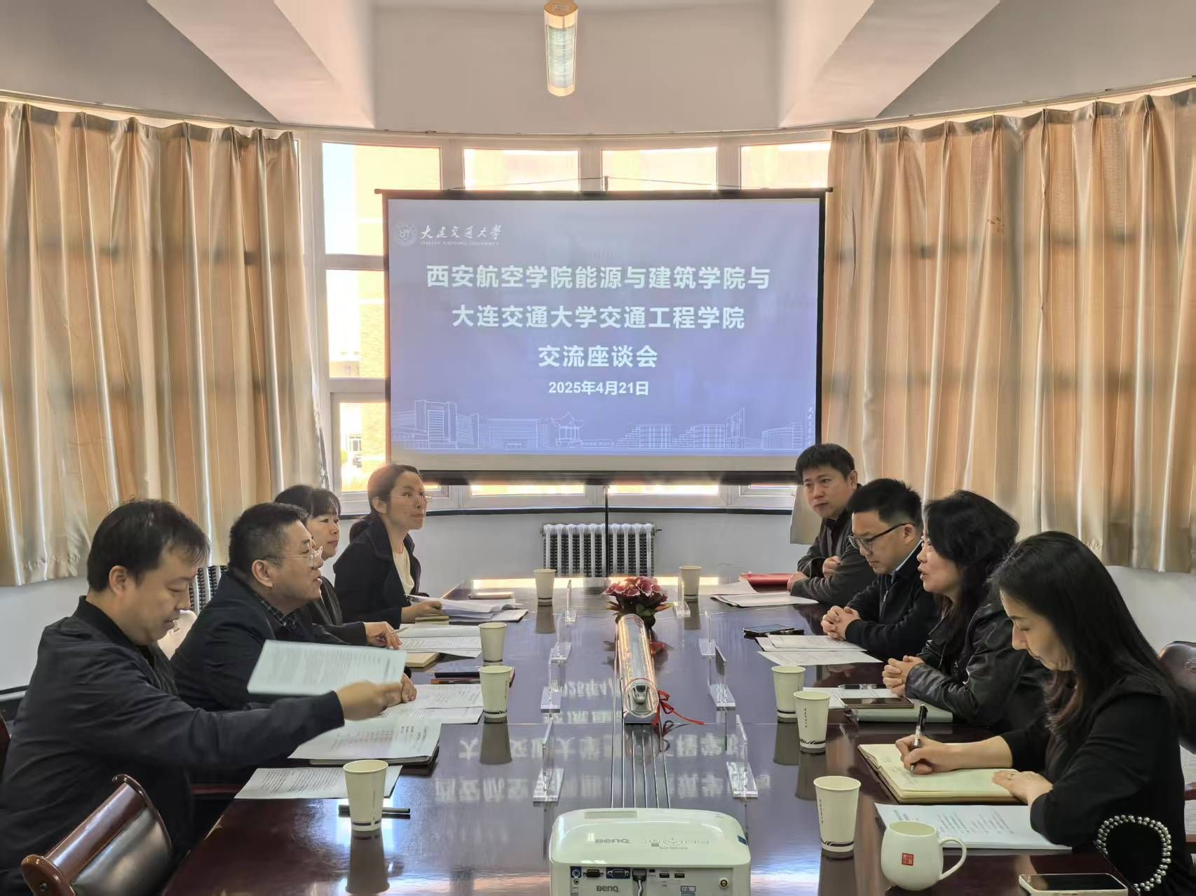 4月21日上午,大连交通大学交通工程学院党委书江阿兰、副院长赵丽华、王海涛及智能建造与智慧交通系主任张蓬勃详细介绍了交通工程学院历史沿革、智能建造与智慧交通专业建设成果及中外合作办学模式等方面先进经验。能源与建筑学院副院长张琛从学院发展历程、专业布局现状及“智能建造+航空特色”的学科融合思路出发,阐述了未来专业升级规划。参会双方就新专业的人才需求、专业定位与特色、课程体系优化、实验室建设、师资队伍建设、教材与资源共建、中外合作办学模式、产教融合路径等方面进行了深度研讨。明确了我院“智能建造与智慧交通”新专业应结合学校办学特点,围绕“道桥为主加航空特色的”专业方向推进,能源与动力工程“中外合作办学项目”应重点关注办学的核心理念、外方高校的选择以及学位证发放等重点问题。