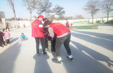 同时志愿者为小朋友带来滑轮与滑板表演,孩子们对表演节目兴趣浓厚,并要求志愿者教他们玩耍。