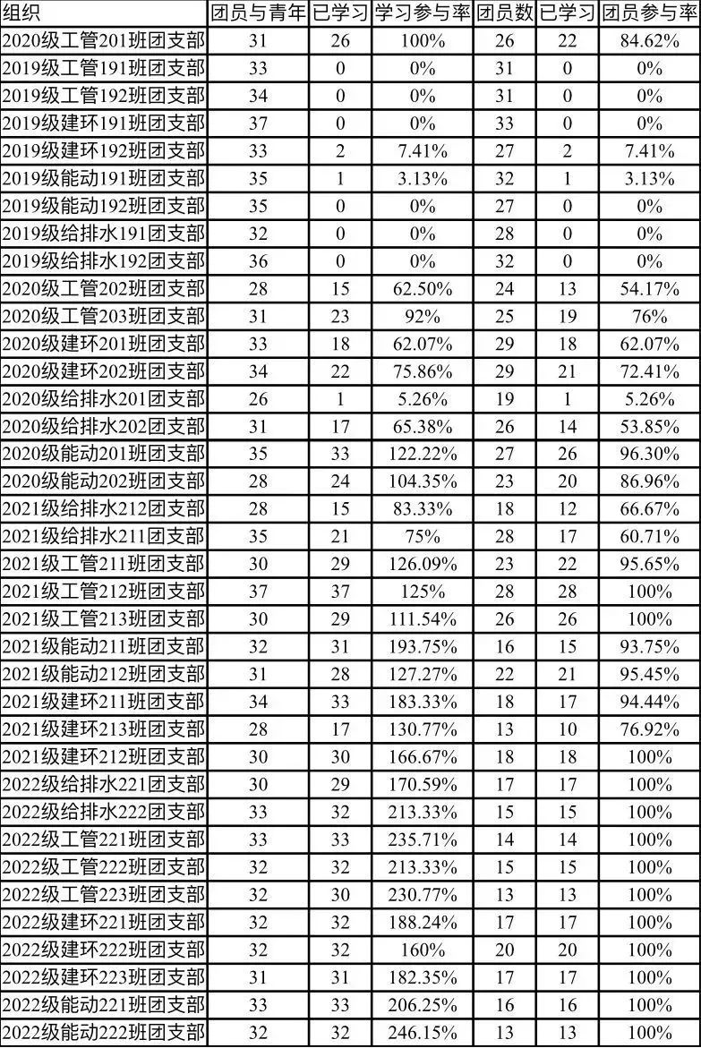 工管191团支部,工管192团支部,建环191团支部,建环192团支部,能动191团支部,能动192团支部,给排水191团支部,给排水192团支部,工管202团支部,工管203团支部,建环201团支部,建环202团支部,给排水201团支部,给排水202团支部,给排水212团支部,给排水211团支部学习参与率均低于100%。