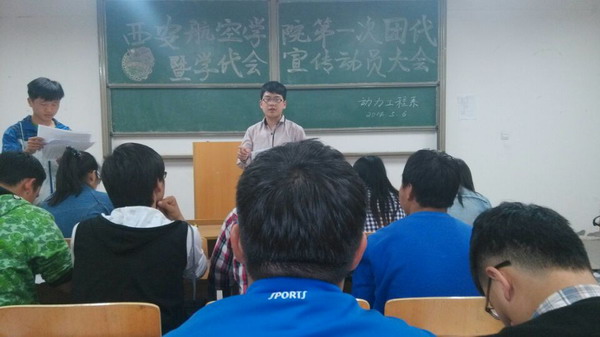 西安航空学院第一次团代会暨学代会即将召开,为做好本次会议宣传,动力系积极响应团委号召,在团总支书记阎静指示下于2014年5月6日晚在阎教1224教室召开“双代会”宣传动员大会。