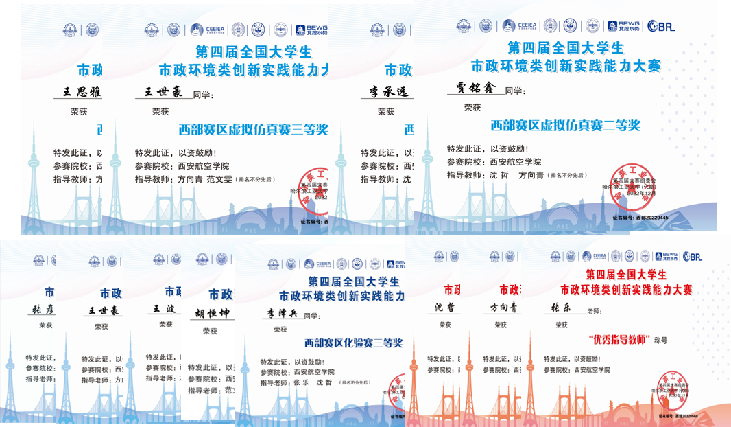 大赛竞赛内容分为化验赛和虚拟仿真赛两大赛项,具体包含《水中高锰酸盐指数的测定》中未知水样的测定、智能水厂运行与调控虚拟仿真软件、污水处理工艺设计虚拟仿真软件、水质检测虚拟仿真软件和水处理工程设计平台虚拟仿真软件五大环节。我校14支队伍42名选手成功参赛,克服了疫情期间药品试剂不到位,指导教师不能全员线下指导,仿真赛时间与学生返乡冲突等重重困难,经过激烈比拼,最终荣获了西部赛区化验赛个人三等奖5人次;西部赛区虚仿赛二等奖2人次;西部赛区虚仿赛三等奖2人次的优异成绩。此外,本次大赛中我校7名教师获“优秀指导教师”荣誉,2名教师获“金牌裁判”称号。
