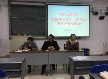 2019年12月10日,能源与建筑学院于阎良校区阎教1234教室召开了2020年研究生入学考试经验交流会。学生管理科科长高振江,就业辅导员阎静、裴蕾,2020届全体考研同学共同参加了本次交流会。
